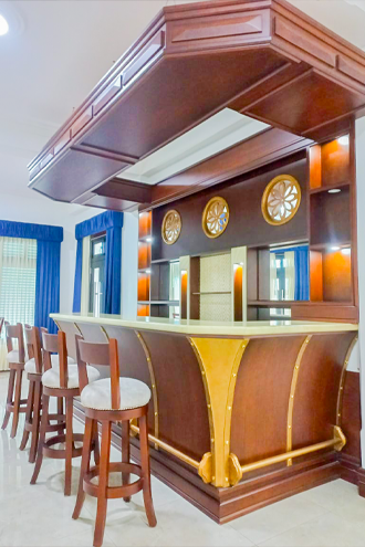 Conjunto de cocina con bar privado ustando tonos semi claros.